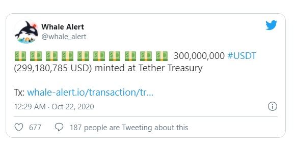 A raíz del aumento de Bitcoin a un nuevo máximo en 2020, la máquina de impresión de Tether ha estado funcionando a toda velocidad y produciendo más USDT. Se han agregado otros 300 millones de dólares en USDT a su reserva durante las últimas 24 horas:
