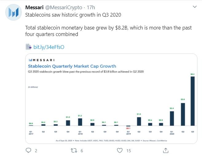 SponsoredUna investigación reciente de Messari, empresa de análisis cripto, ha profundizado en el mundo en expansión de las stablecoins. Los datos muestran que hubo un crecimiento histórico en el tercer trimestre, ya que se sumaron más de 8 mil millones de dólares a su capitalización de mercado combinada: