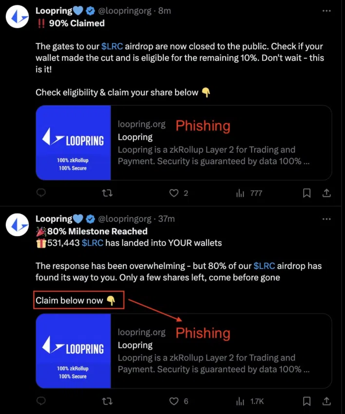 La cuenta oficial de Loopring en X (Twitter) parece haber sido comprometida por atacantes de phishing que piden a los miembros de la comunidad que reclamen un airdrop de LRC.
