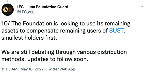 El resultado final es propio de una película de terror, concluyendo en que la fundación está analizando utilizar los fondos restantes para compensar a los usuarios portadores de UST que sufrieron la pérdida de valor, según LFG primero se pagará a los holders más pequeños.