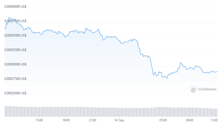 Tras haber alcanzado un máximo de 0.00058 dólares hace una semana, al momento de la publicación cotiza en 0.00028 dólares, lo que representa una caída del 20% en las últimas 24 horas.