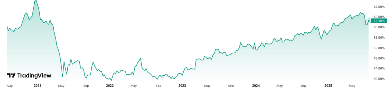 Desde 2023, el panorama muestra un cambio estructural: el dominio alcanzó hoy el 62.53% y sus variaciones diarias son mucho menores. Esta estabilización responde a una mayor madurez del mercado, con el ingreso de capital institucional y la consolidación de Bitcoin como activo central.