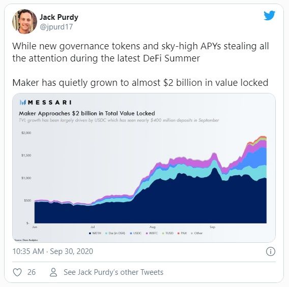 Si bien el fervor y el enfoque recientes se han centrado en todas las nuevas ofertas de DeFi que han estado apareciendo casi a diario, Maker ha evolucionado y creciendo silenciosamente. La plataforma de crédito descentralizada ha sido eliminada del primer lugar en las listas de TVL (valor total bloqueado, en español) de DeFi, pero se está esforzando para cerrar la brecha.
