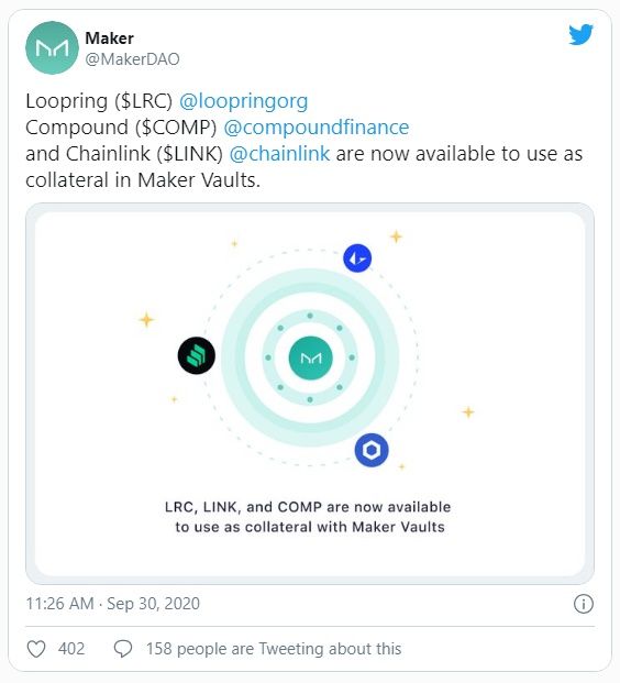 El último anuncio de Maker es la adición de tokens Chainlink, Loopring y Compound para usar como garantía en sus bóvedas: