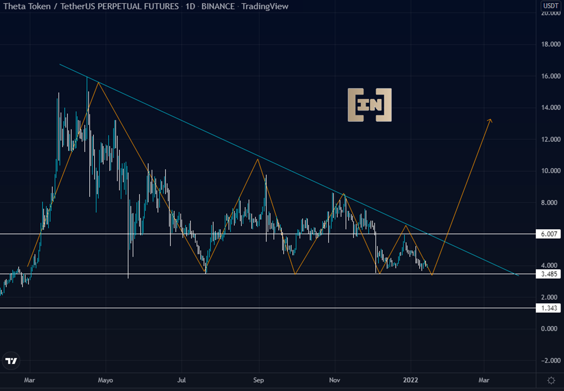 El precio de THETA se encuentra dentro de la formación chartista triángulo descendente. Por lo general, esta figura tiende a pronosticar una posible ruptura en el soporte.