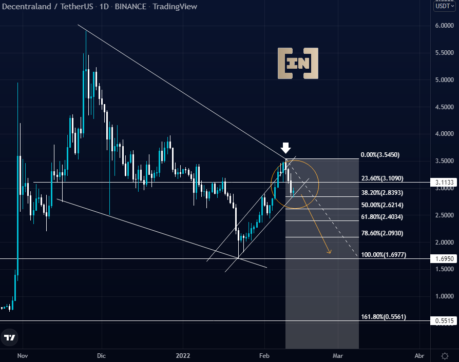 En el precio de SAND, a diferencia de MANA, se puede apreciar mejor la formación del banderín bajista (Línea Azul). Su último rechazo sobre el área de los 5 dólares confirma la continuidad bajista dentro de un gran canal descendente en temporalidad diario.
