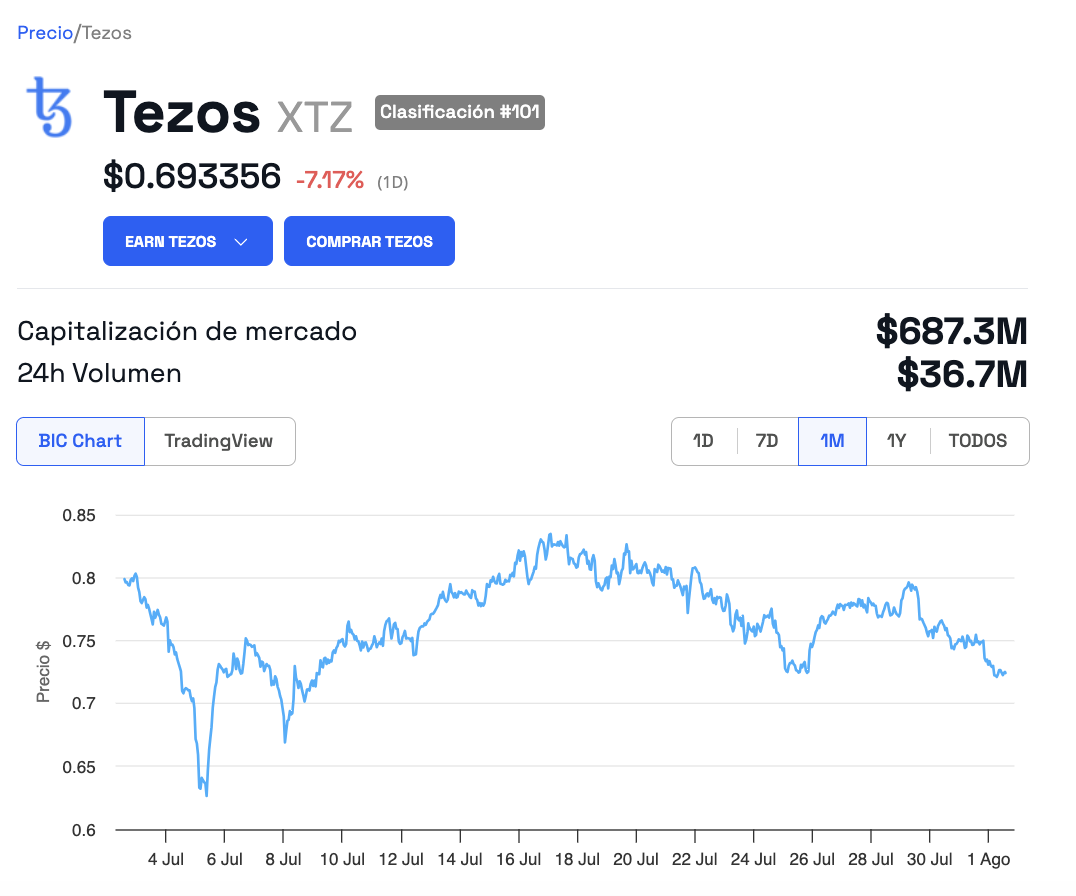 Sus pérdidas diarias superan el 6,85%. En tanto, la capitalización de mercado de Tezos ha pasado de 1,52 mil millones de dólares en marzo de 2024, a 692 millones de dólares para el 01 de agosto de 2024.