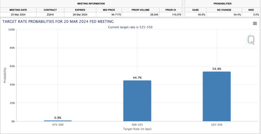 El análisis de Rieder sugiere paciencia estratégica por parte de la Fed, con una preferencia por iniciar recortes de tipos en mayo, con un ajuste potencial de 25 puntos básicos bimensuales. En línea con los pensamientos de Rieder, la captura de pantalla a continuación de CME Group muestra una probabilidad del 54,4% de que la Fed mantenga los tipos de interés sin cambios en marzo.