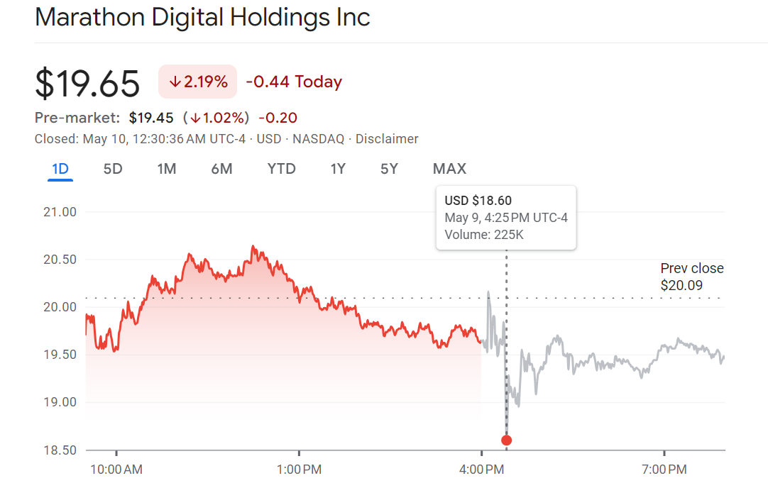 El precio de las acciones de Marathon Digital (MARA) cayó tras el informe de resultados. Durante el trading after-hours, el precio de MARA cayó a 18.60 dólares el 9 de mayo. A más largo plazo, el precio de MARA ha caído un 14.30% en lo que va de año.
