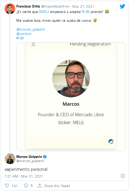 SponsoredAnte el hecho publicado en una cuenta de Twitter, Galperín respondió que se trata de un “experimento personal”. Con su registro de humanidad confirmado, ahora recibirá tokens UBI a razón de 1 cada hora como “ingreso básico universal“.