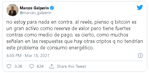 Además, Galperín se ha mostrado crítico de la minería de criptomonedas, ya que según su punto de vista tienen un “problema de consumo energético”.