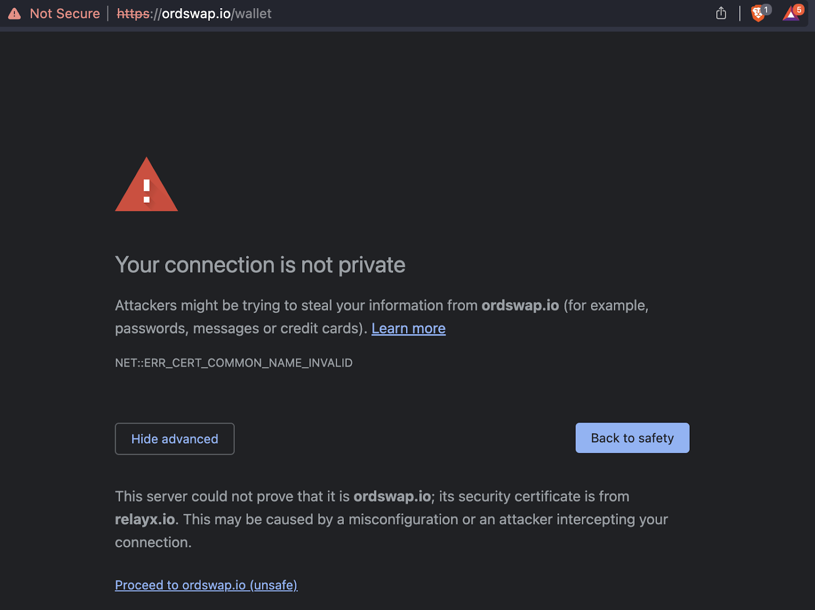 “Este servidor no pudo demostrar que es ordswap.io; su certificado de seguridad es de Relayx.io. Esto puede deberse a una mala configuración o a que un atacante intercepte su conexión.”