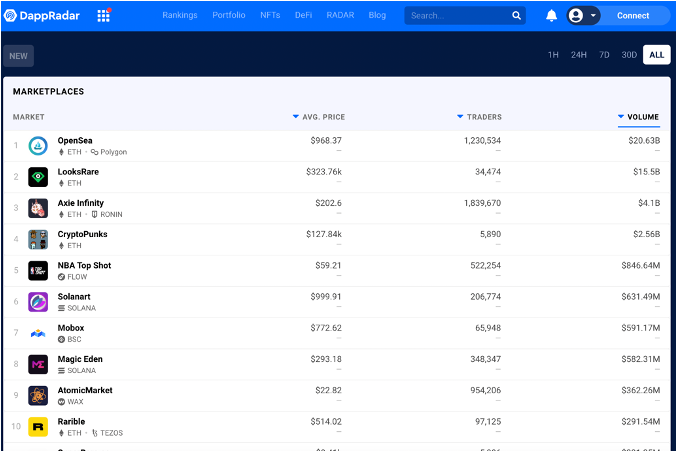 Según los datos de DappRadar, una página web especializada en rastrear métricas sobre exchanges y marketplaces de criptomonedas, más de 20 mil millones de dólares han sido operados a través de OpenSea en los últimos 2 años.