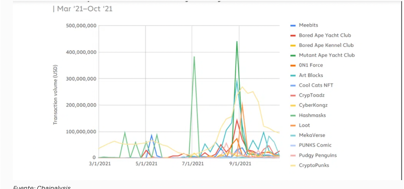 En gráfica anterior, se pueden visualizar cuáles han sido las transacciones de NFT más populares desde enero hasta octubre de 2021.