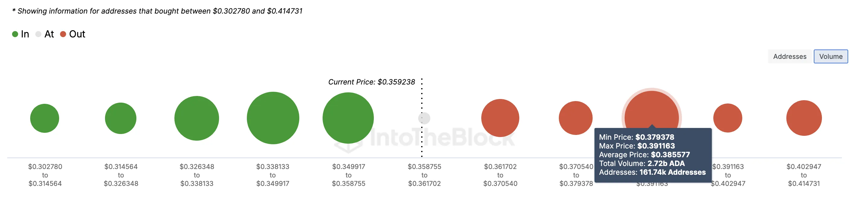 Por lo general, cuanto mayor es el grupo de direcciones o volumen, más fuerte es el soporte o la resistencia. Aunque el precio de Cardano podría subir, estas direcciones, que sostienen cantidades sustanciales, podrían desencadenar una presión de venta que podría impedir un mayor movimiento ascendente por encima de 0,39 dólares.