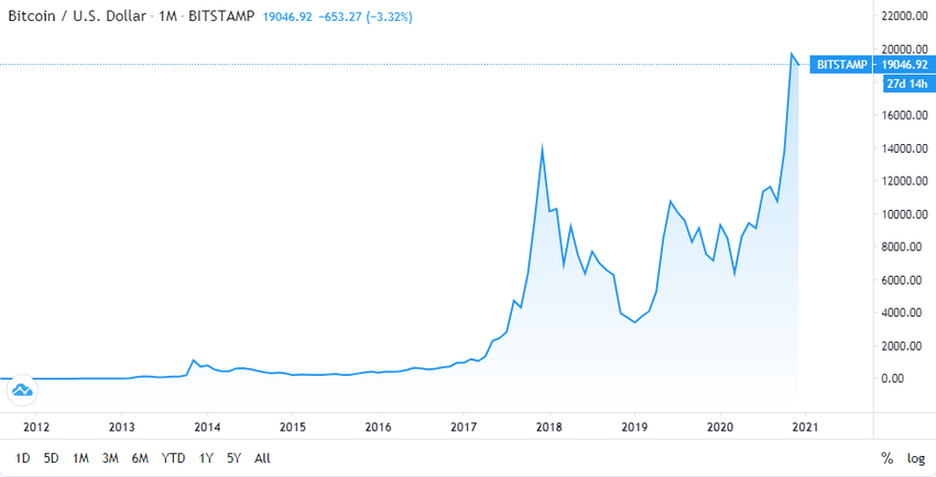 Con el cierre de Bitcoin en 18,702 dólares el 30 de noviembre, los inversores a largo plazo habrían ganado entre 1524% y 13,856%.
