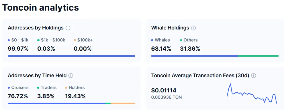 Según CoinMarketCap, más del 68% del suministro total de Toncoin está en manos de monederos de ballenas. Esta distribución desproporcionada levanta banderas rojas, aumentando el riesgo de volatilidad de precios causada por operaciones a gran escala de los principales holders.
