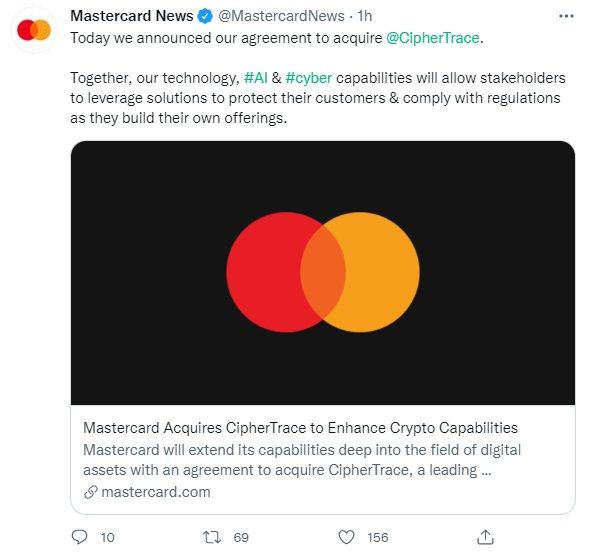 A través de un comunicado de prensa publicado el 9 de septiembre, Mastercard anunció un acuerdo para adquirir la empresa líder en inteligencia de criptomonedas, CipherTrace.