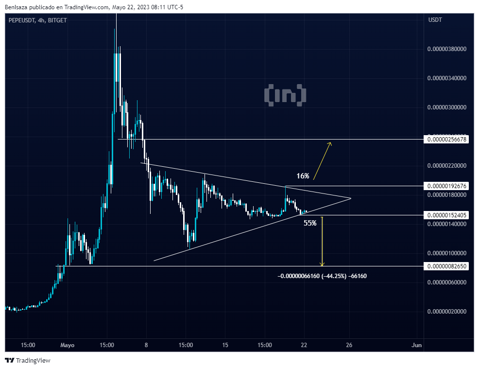 PEPE/USD, se traza igualmente la formación chartista triangulo simétrico cuya probabilidad de continuación bajista es de un 55%.