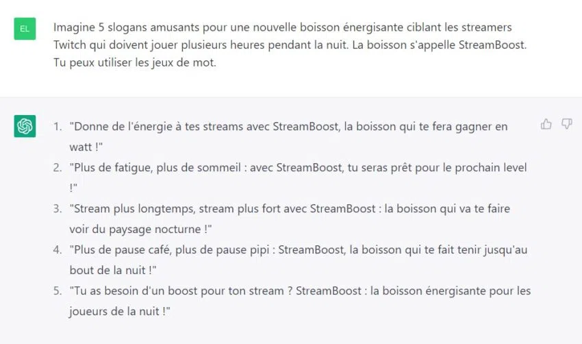 La inteligencia artificial también puede proporcionarle eslóganes en cualquier producto y en cualquier tono. Esto, por ejemplo, es lo que ChatGPT nos ofreció con respecto a una bebida energética imaginaria dirigida a los streamers llamada StreamBoost.