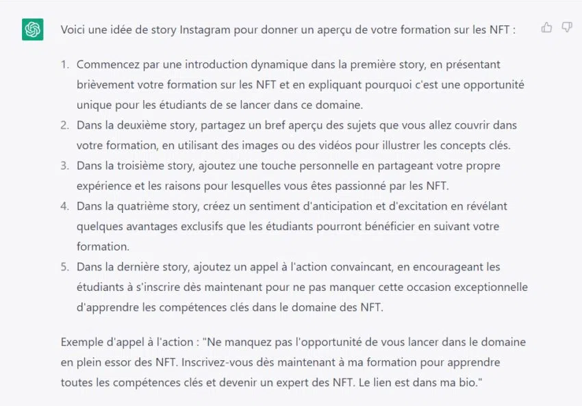La inteligencia artificial puede generar un guión de historia completo para tus redes sociales, desde argumentos para plantear hasta movimientos de cámara. Como ejemplo, esto es lo que ChatGPT nos ofreció para promover una capacitación para explicar los principios de los NFT de Bitcoin y cómo usarlos.