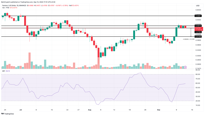 El gráfico diario muestra un aumento en la entrada de capital, como lo indica el Money Flow Index (MFI). Este aumento de capital fue uno de los factores clave que inicialmente llevó el precio de FTM a 0.51 dólares.