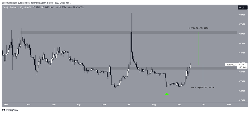 El precio de STORJ ha aumentado desde su mínimo de 0.19 dólares el 17 de agosto. El mismo día, el precio creó una mecha larga y baja (ícono verde), considerada una señal de presión de compra.