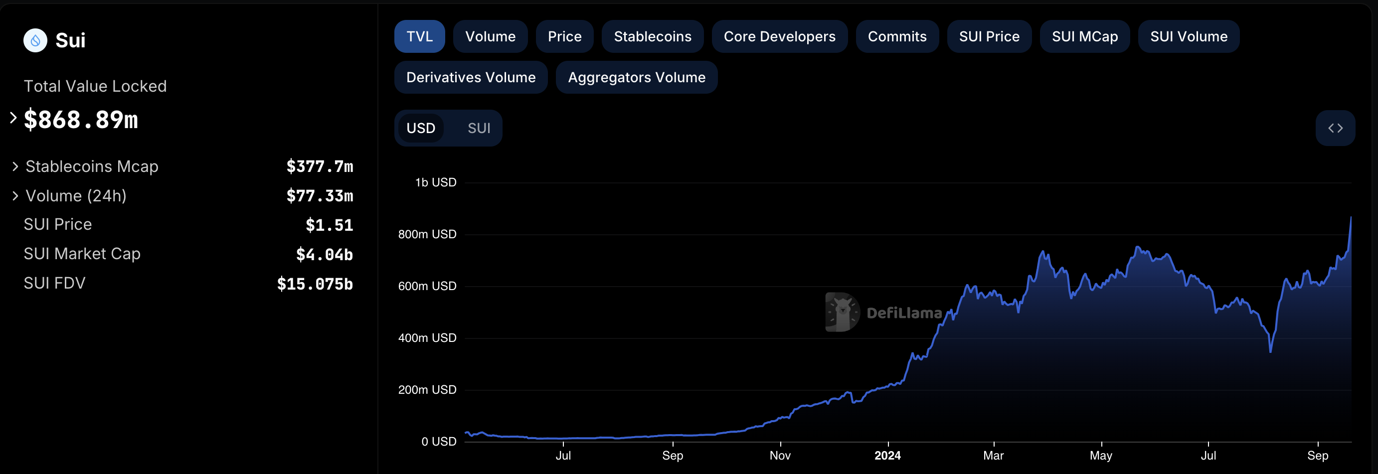 Según DeFiLlama, el TVL ahora es de 868.89 millones de dólares. Este aumento implica un aumento en el capital bloqueado en la blockchain programada en Move, indicando confianza percibida y un ecosistema saludable.