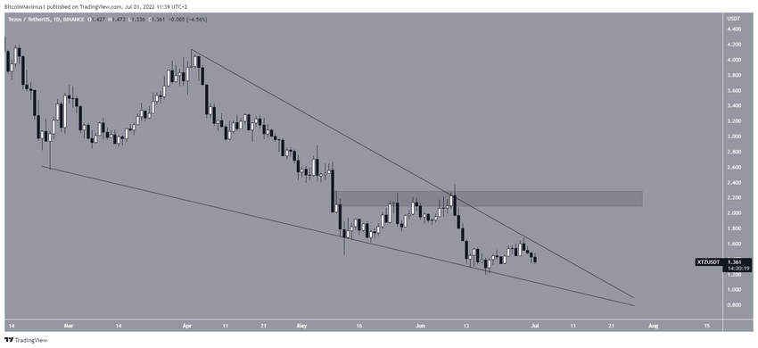 XTZ ha estado cayendo dentro de una cuña descendente desde el 24 de febrero. La cuña se considera un patrón alcista, lo que significa que conduce a rupturas la mayor parte del tiempo.