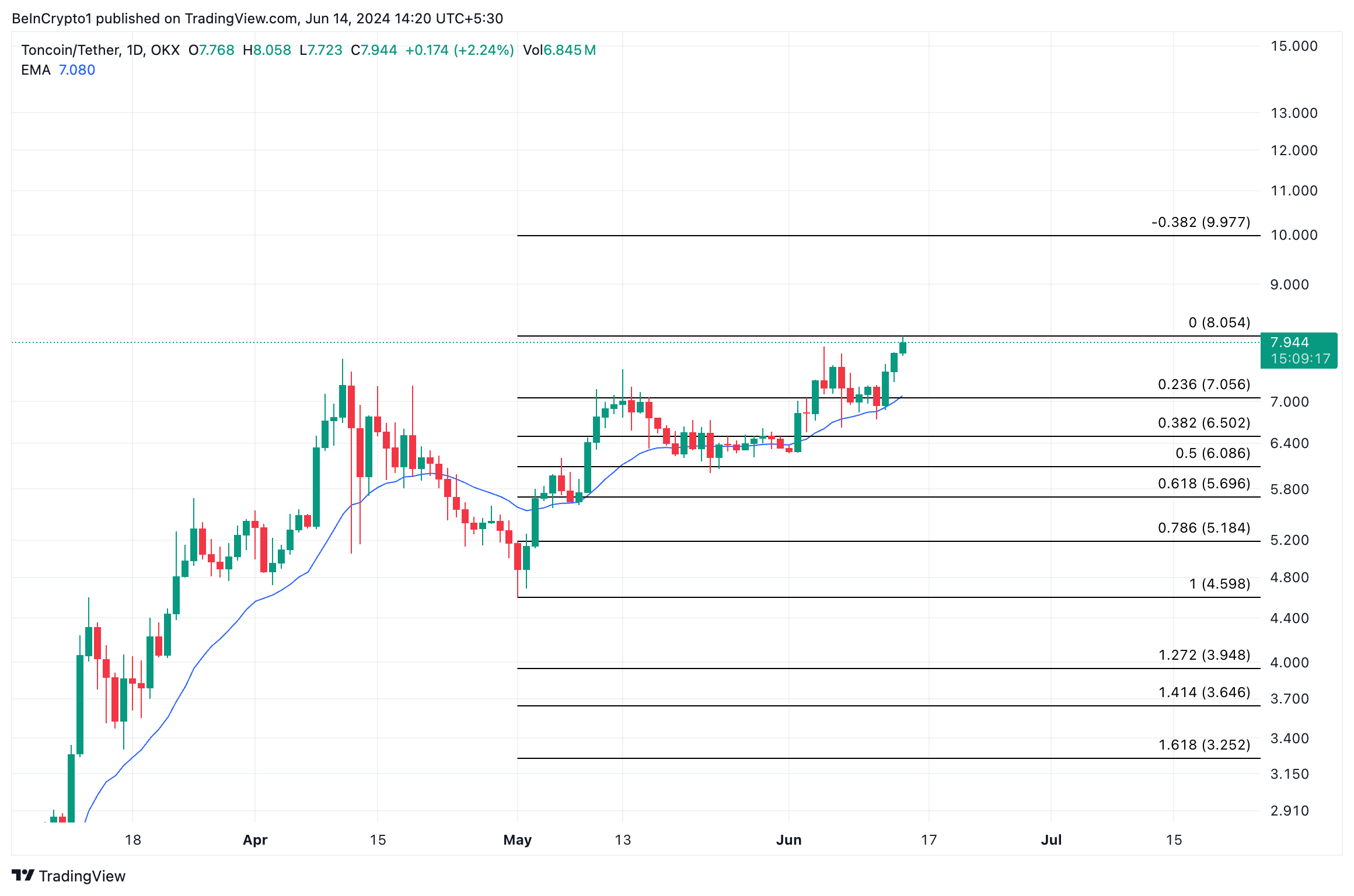 Si el sentimiento alcista sigue creciendo, el precio de TON podría aumentar por encima de los 8.05 dólares.