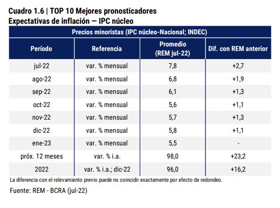 Para julio de 2022, por su parte, la mediana de las estimaciones del relevamiento actual se ubicó en 7,5% mensual. El promedio del TOP-10 de las y los mejores pronosticadores la estima en 7,7%.
