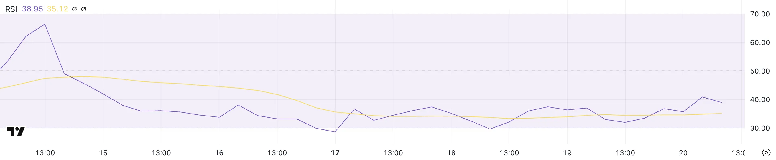 Por el contrario, un RSI por encima de 70 sugiere condiciones de sobrecompra, señalando una posible corrección de precios. Con su RSI en 38,5, MELANIA se está acercando a territorio de sobreventa pero aún no ha llegado. Este nivel sugiere que el sentimiento bajista es fuerte, pero podría ocurrir una reversión potencial si surge interés de compra.