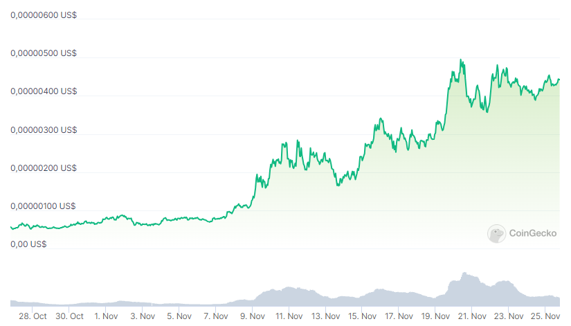 En medio de este rally, BONK registró un máximo histórico el pasado 20 de noviembre, cuando su precio alcanzó la marca de los 0.00000539 dólares.