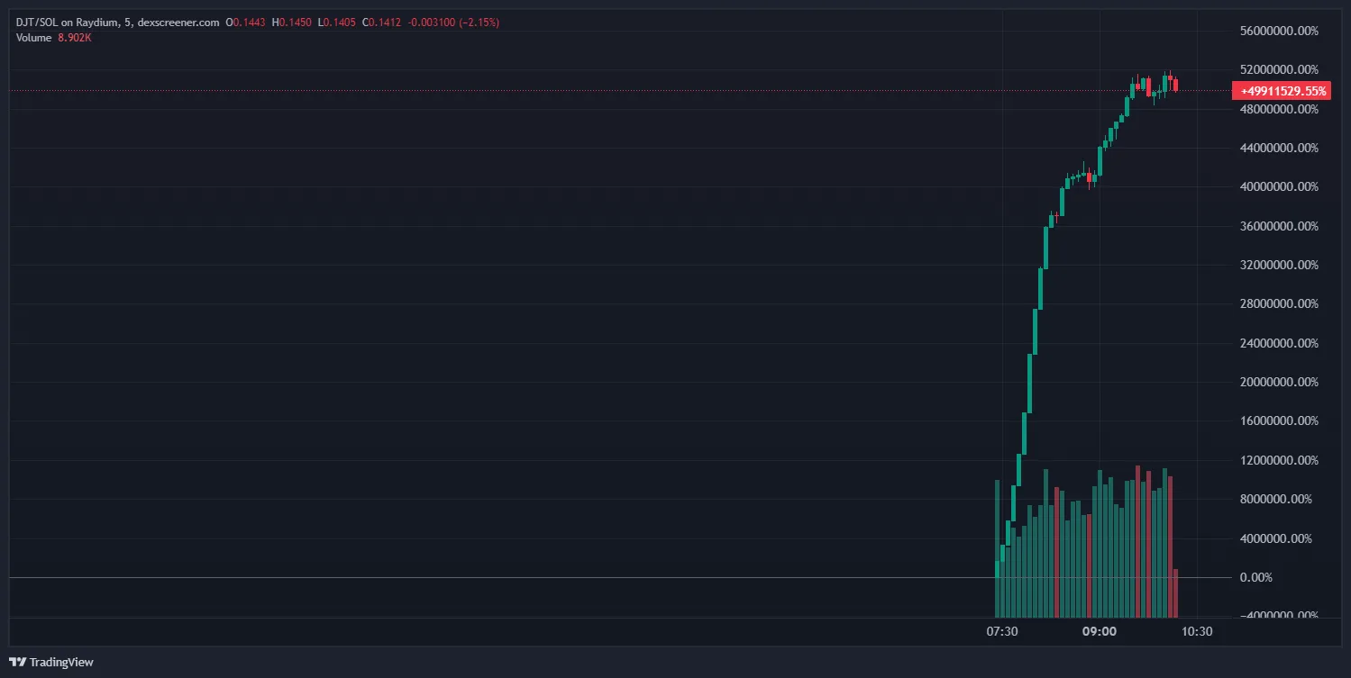 SponsoredEsta noticia ha tenido un impacto significativo en las memecoins relacionadas con Trump, con la recién acuñada TrumpCoin (DJT) disparándose casi un 50,000.000% en menos de tres horas, elevando su capitalización de mercado a 143,1 millones de dólares.