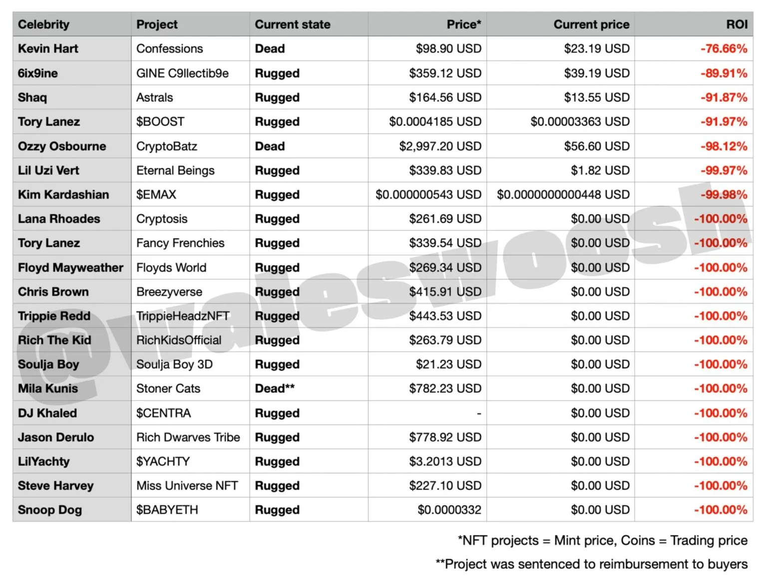 En respuesta a la tendencia de las memecoins de famosos, Wale Moca, investigador de Azuki, examinó anteriores proyectos cripto propiedad de famosos y promovidos por famosos. Según Moca, todos fracasaron y la mayoría fueron scams. Este patrón plantea dudas sobre la sostenibilidad y la integridad de estas empresas: