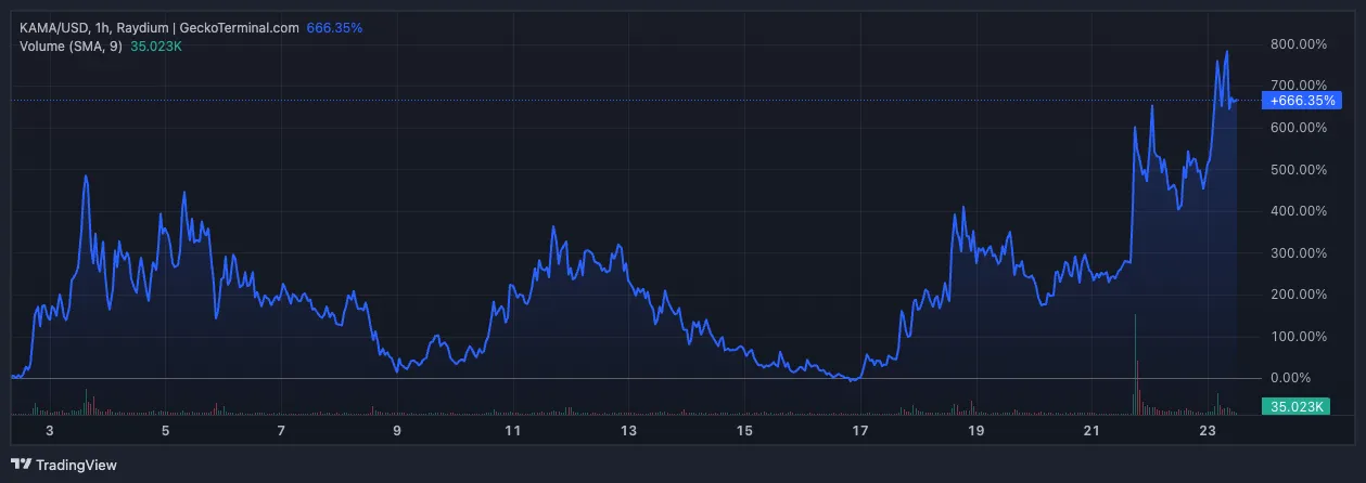 Tras este desarrollo, la memecoin KAMA se disparó más del 40% en un solo día. Ahora se negocia a 0,02373 dólares, cerca de su máximo histórico, con una capitalización de mercado que supera los 20 millones de dólares. Según datos de GeckoTerminal, esto representa un impresionante aumento del 666% desde principios de julio, reflejando un aumento en el interés especulativo.