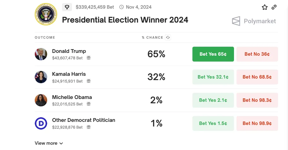 Actualmente, los mercados de apuestas políticas le dan a Harris un 32% de posibilidades de ganar las elecciones presidenciales de Estados Unidos. Muchos consideran esto como una métrica para apostar por la memecoin KAMA.