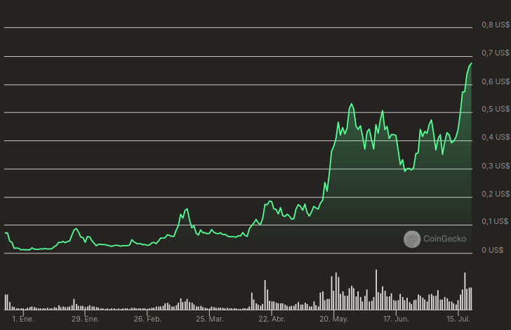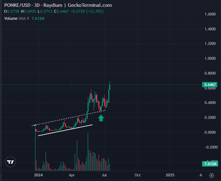 El día de ayer, la memecoin basada en Solana registró un nuevo máximo histórico de 0.6744 dólares tras aumentar 70% en la última semana. Al mismo tiempo, PONKE experimenta un aumento del 7,173.4% desde su mínimo histórico de 0.00928 dólares registrado el 3 de enero de 2024.