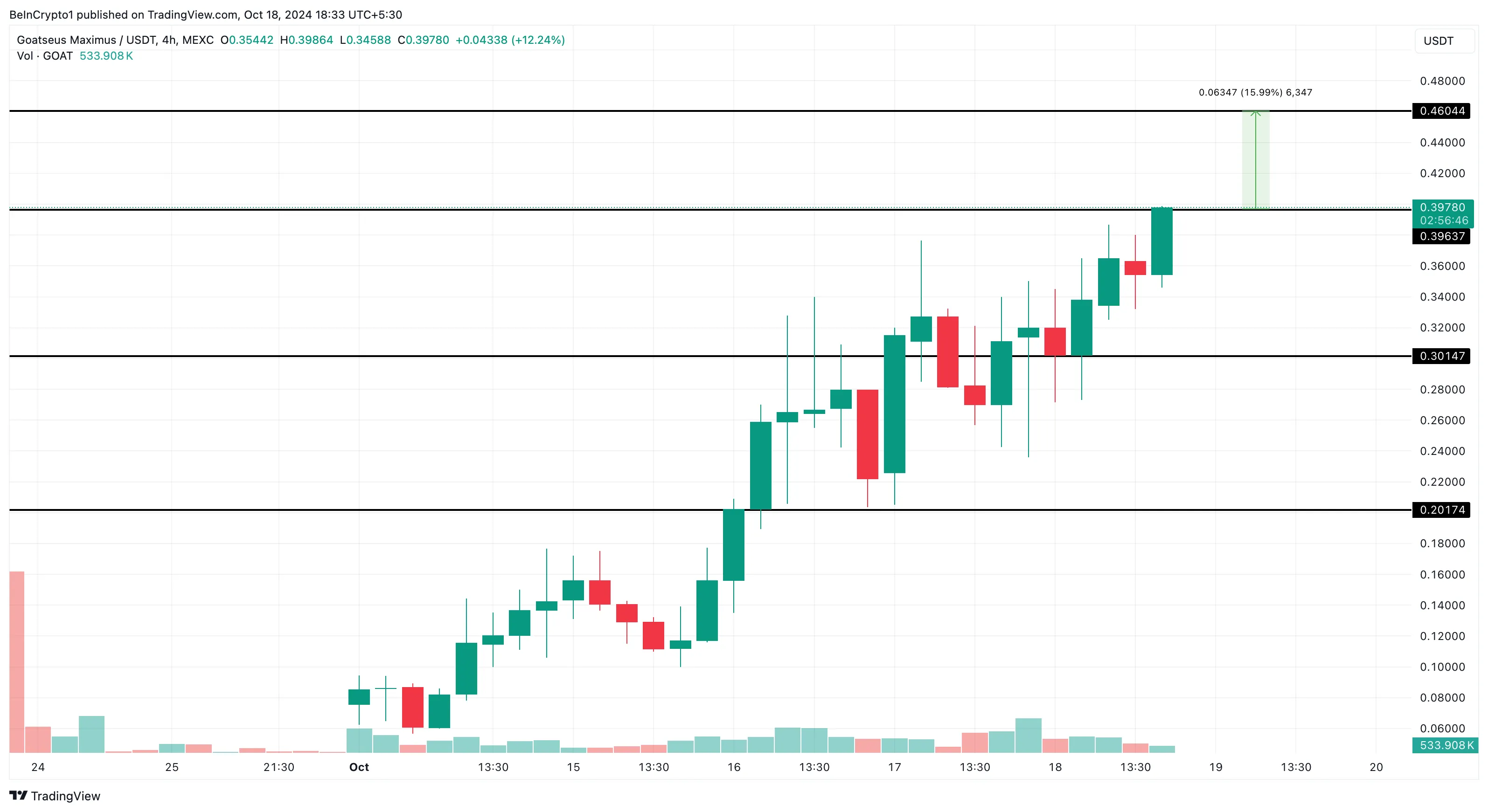 Un análisis más detallado de la configuración técnica de 4 horas para Goatseus Maximus sugiere que la memecoin tiene un potencial significativo para más ganancias. El token ha establecido un fuerte nivel de soporte en 0,30 dólares, que ha mantenido firme.