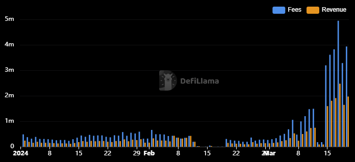 De acuerdo a los datos presentados por DefiLlama, las comisiones diaras de transacción en Solana se han disparado de 361,000 dólares el 31 de diciembre a un máximo histórico de 4,95 millones de dólares el 17 de marzo. Este cifra representa un aumento de más del 1,000%.