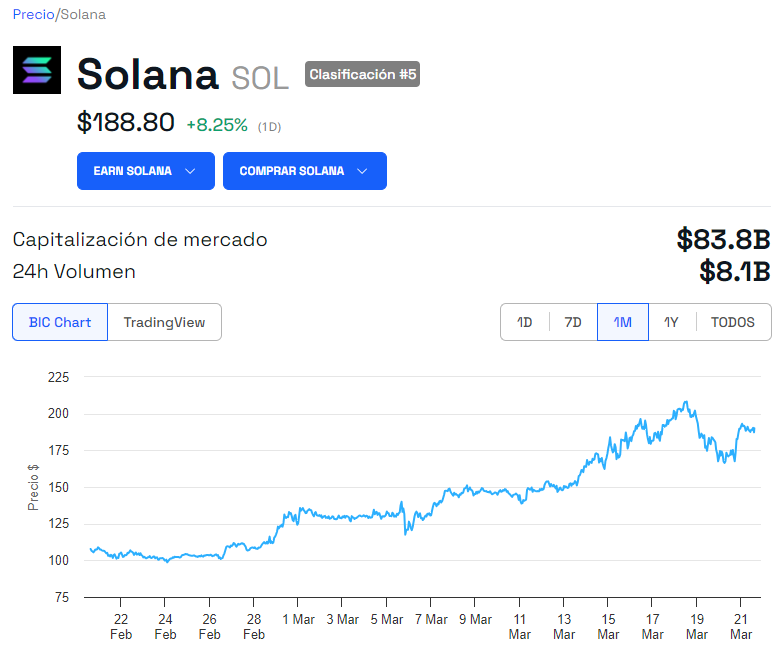 Tras superar nuevamente la marca de los 100 dólares a finales de febrero, el precio de Solana explotó considerablemente. El pasado 18 de marzo, SOL superó los 200 dólares y registró un máximo anual de 208.33 dólares.