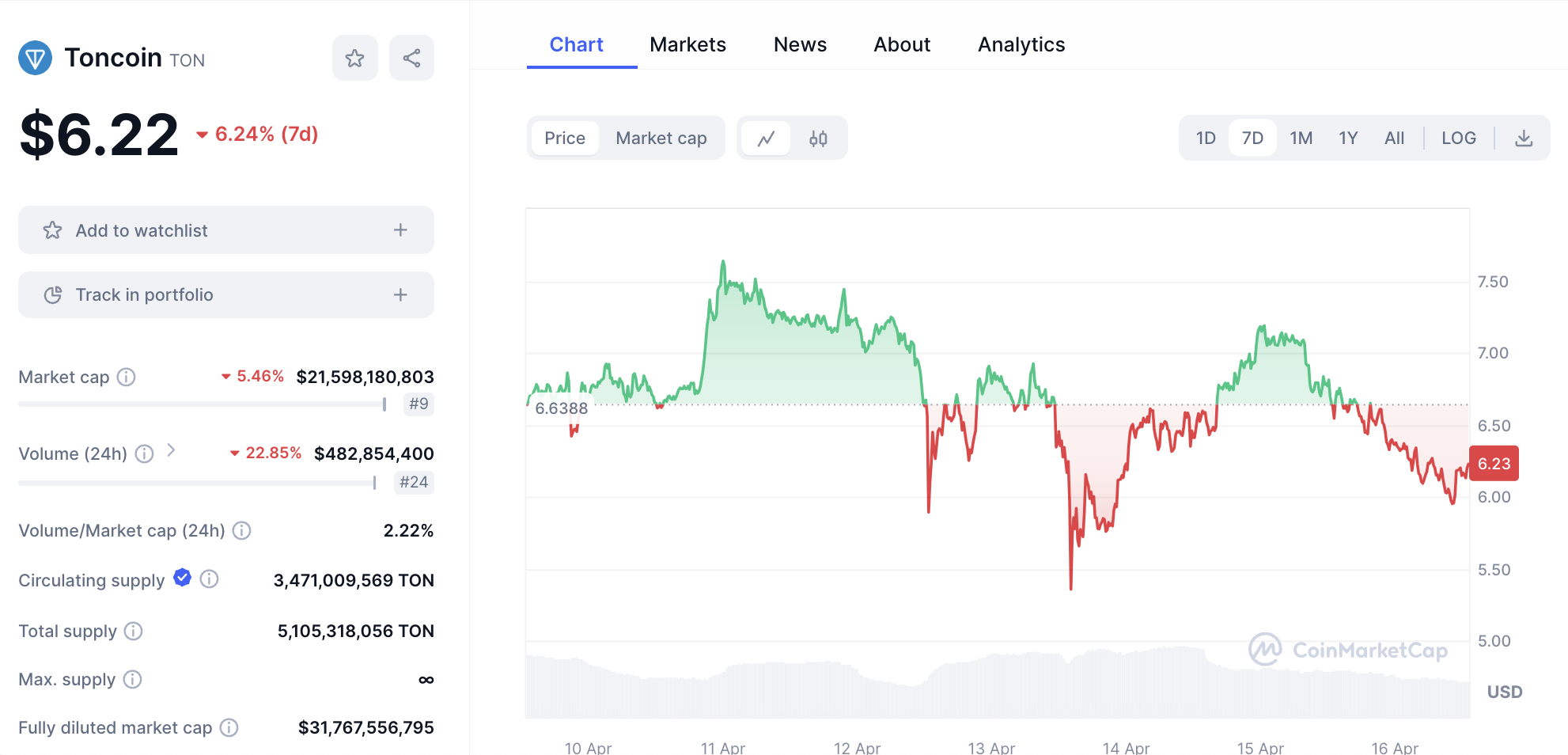Según CoinGecko, en las últimas 24 horas el precio de Toncoin (TON) ha caído 12% a 6,25 dólares. La caída provocó una caída en el mercado cripto en general, debido en gran parte a factores geopolíticos.