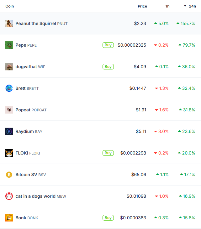 Ocho de las diez criptomonedas con mejor rendimiento en las últimas 24 horas son memecoins. Mientras que PEPE y PNUT lideran con ganancias excepcionales, otros tokens de meme similares han visto crecimientos por debajo del 40%.