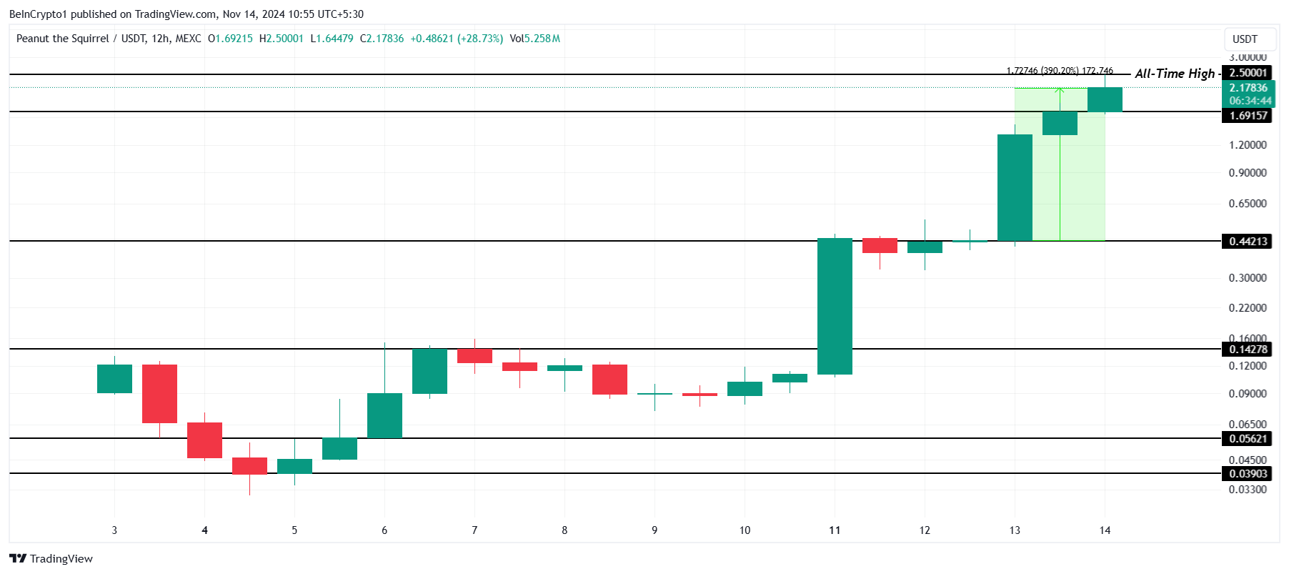 Actualmente valorado en 2.07 dólares, el rally de PNUT podría continuar su tendencia ascendente, potencialmente superando el máximo histórico de hoy de 2.50 dólares si la demanda se mantiene estable.