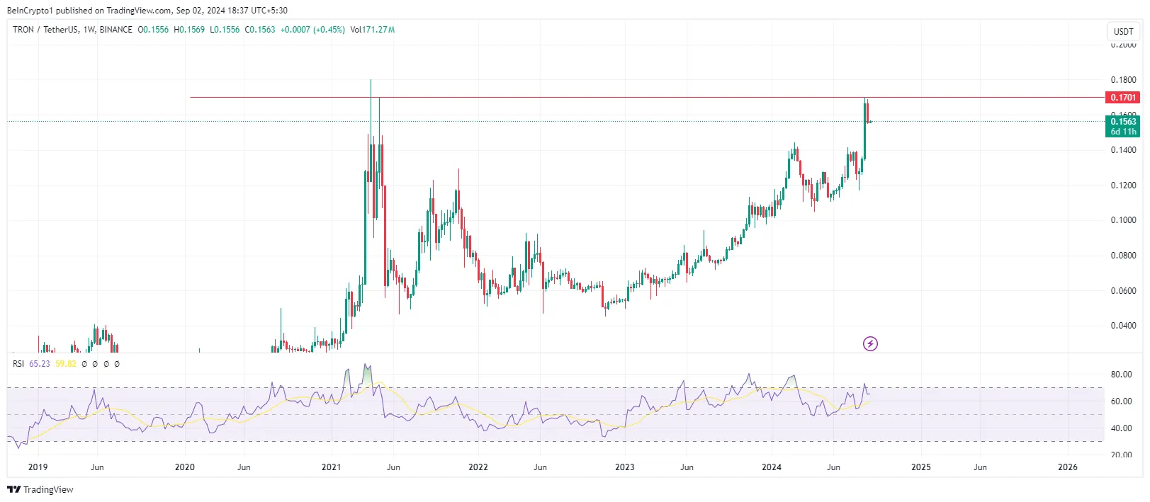 El optimismo en torno a SunPump continúa impactando positivamente en el token de poder de Tron, TRX. Agosto fue el mes más alcista para TRX desde abril-mayo de 2021, con el token ahora a solo un 13% de su pico de 2021 de 0,1800 dólares.