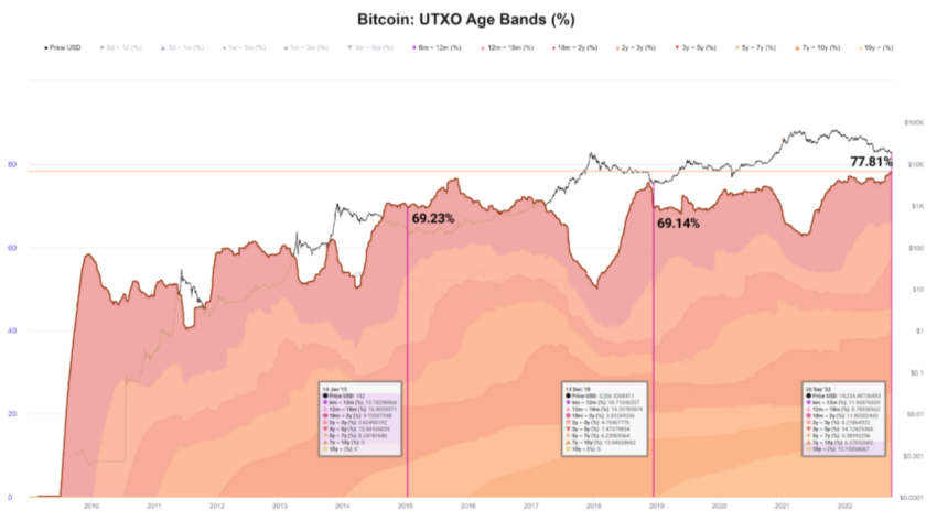 Los datos de CryptoQuant muestran que el suministro total actual es de 19,161,796 y que la cantidad de BTC en poder de los LTH (UTXO> 155 días) se acerca actualmente a un máximo histórico. Además, el porcentaje de la oferta en manos de estos usuarios ya ha alcanzado un nuevo máximo.