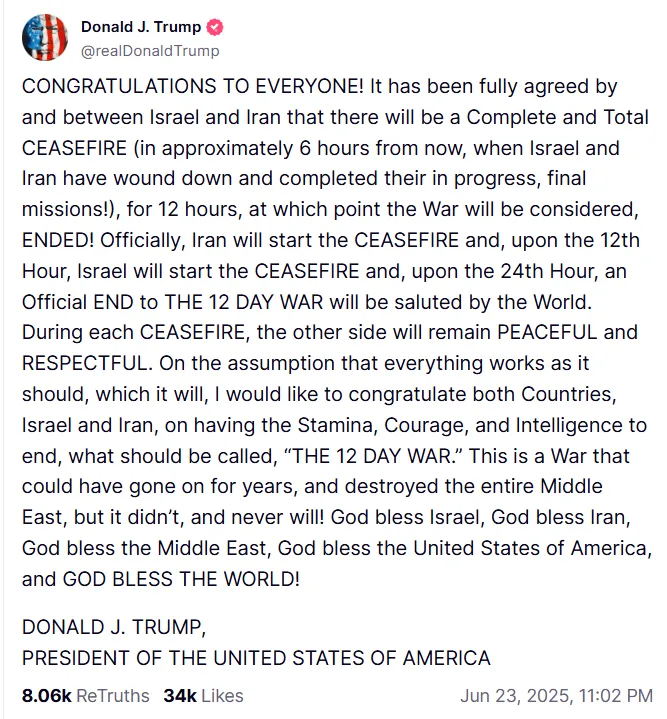 Trump declaró que la guerra de 12 días “terminó oficialmente” tras un cese al fuego de dos etapas de 24 horas que será iniciado primero por Irán y luego por Israel.