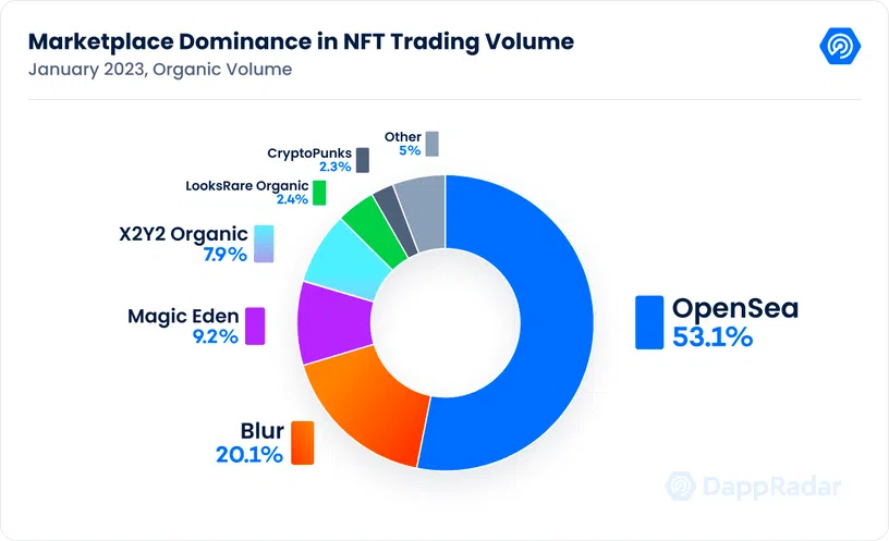 Ethereum sigue siendo la cadena con el mayor volumen de negociación de NFT, con un dominio del 78,5%. Sin embargo, Polygon está mostrando un impulso significativo, con un volumen de transacciones que crece un 124% mes a mes a 46 millones de dólares en enero de 2023.