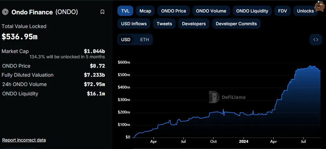 Mientras tanto, es crucial destacar a Ondo Finance (ONDO) como un proveedor líder de Tesoros de Estados Unidos tokenizados. Según datos de DefiLlama, el valor total bloqueado (TVL) en ONDO supera los 536 millones de dólares, representando productos equivalentes en efectivo.