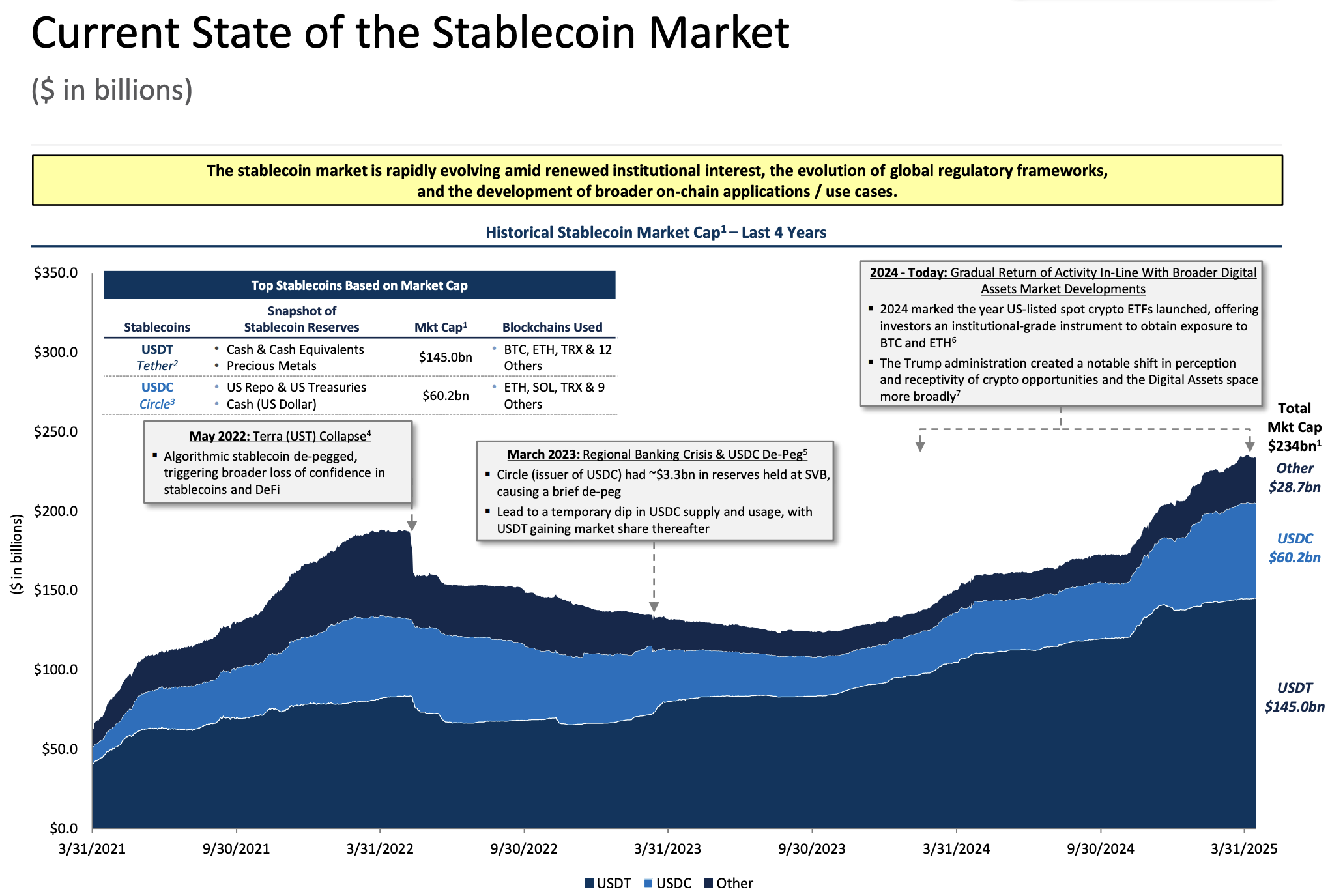 Actualmente, las stablecoins vinculadas al dólar dominan el mercado, representando más del 99% de la capitalización de mercado. Tether (USDT) es el líder, con una capitalización de 145 mil millones de dólares. USDC (USDC) de Circle ocupa el segundo lugar con una capitalización de mercado de 60 mil millones de dólares.